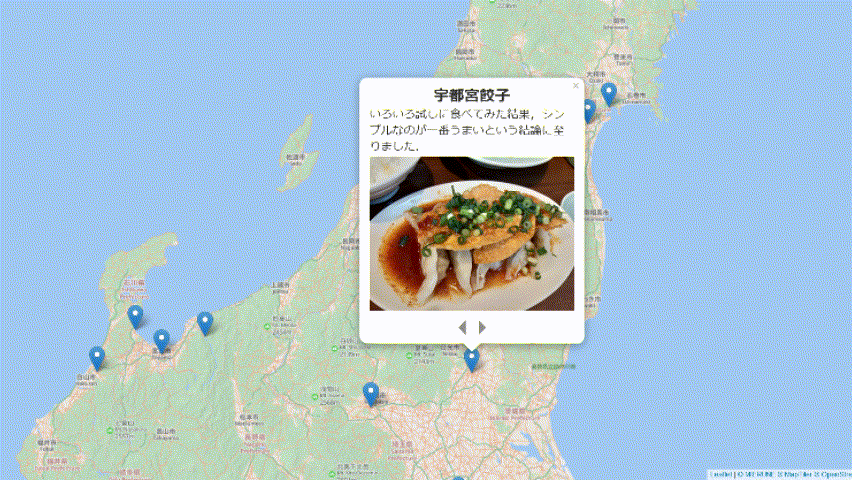 LeafletのPopupで複数の画像をスライド形式で表示させる機能を目指します. 下の手順を踏んでコードをコピー&ペーストすると次のような地図を瞬殺で作れます.